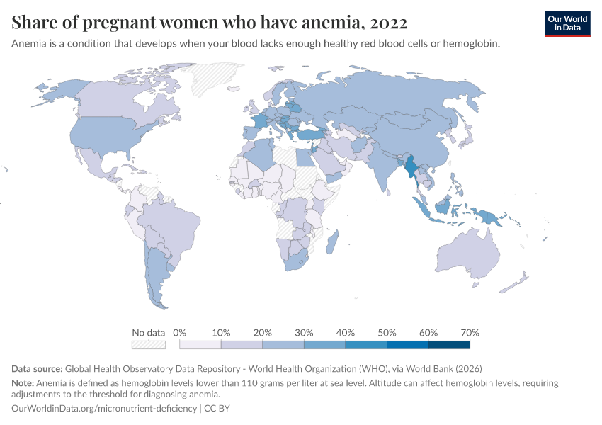 However, progress in reducing rates of anemia has been incredibly slow in recent decades. Globally, the share of pregnant women and women of reproductive age who are anemic has not changed since 2000.