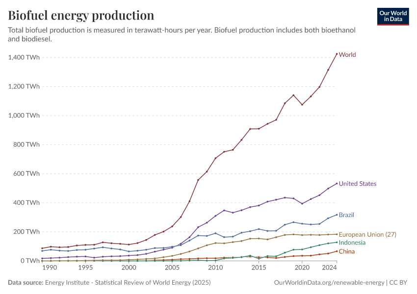 Hannah Ritchie and Pablo Rosado (2026) - “Putting solar panels on land used for biofuels would produce enough electricity for all cars and trucks to go electric” Published online at OurWorldinData.org. Retrieved from: 'https://data-measles-pipeline-fix.owid.pages.dev:8789/20260123-150202/biofuel-land-solar-electric-vehicles.html' [Online Resource] (archived on January 23, 2026).BibTeX citation