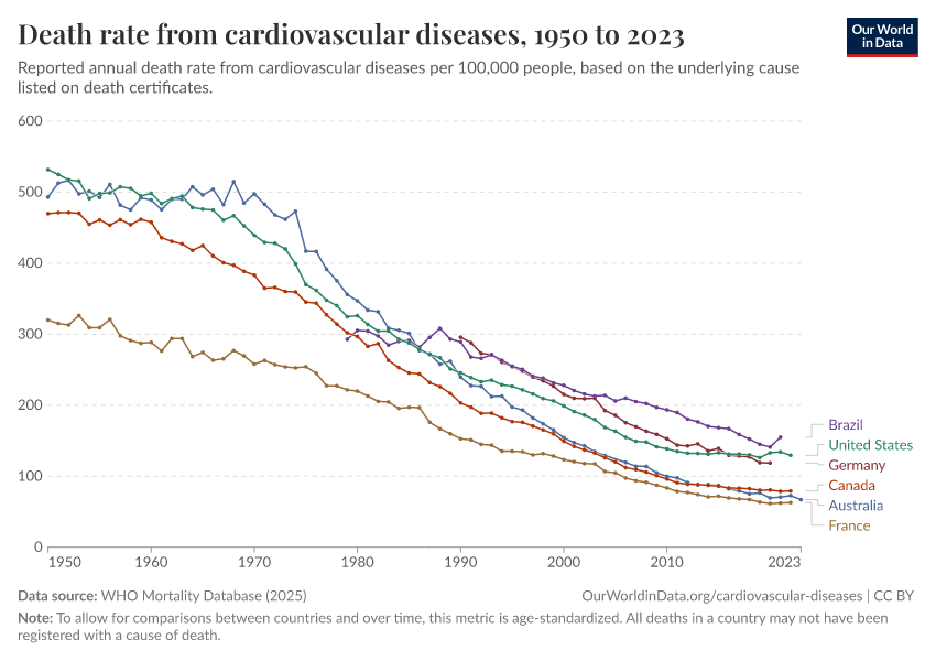 Saloni Dattani (2025) - “Death rates from cardiovascular disease have fallen dramatically — what were the breakthroughs behind this?” Published online at OurWorldinData.org. Retrieved from: 'https://data-measles-pipeline-fix.owid.pages.dev:8789/20260119-084543/cardiovascular-deaths-decline.html' [Online Resource] (archived on January 19, 2026).BibTeX citation