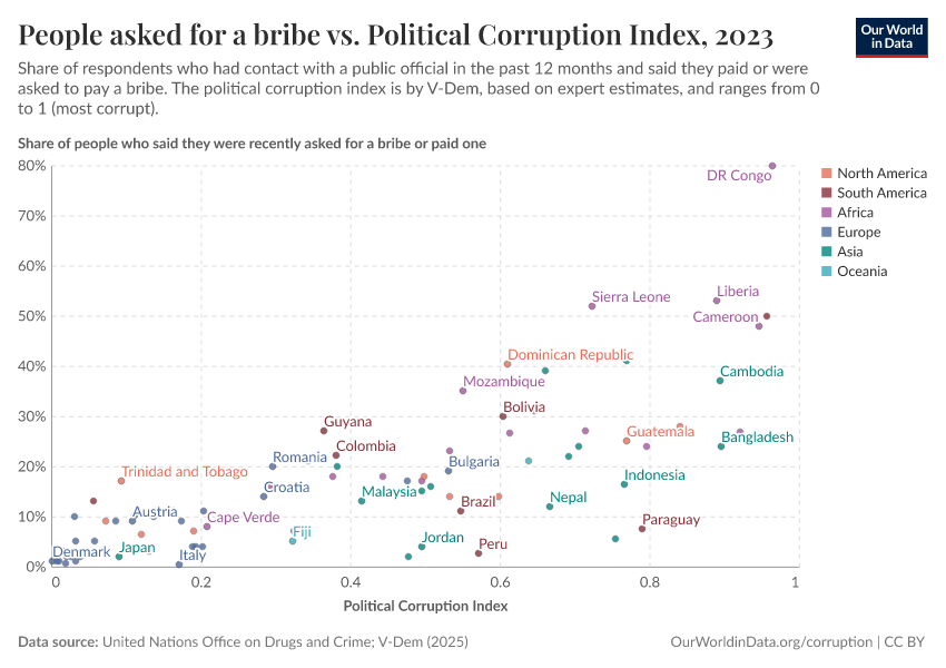 The map below shows the large differences between countries in these surveys. In much of Europe, and a few other countries around the world, reports of bribery are rare: fewer than 10% of people who recently dealt with a public official report having paid or being asked for a bribe.