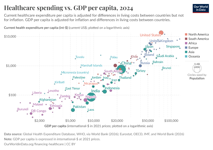 Esteban Ortiz-Ospina, Pablo Arriagada, and Max Roser (2017) - “Healthcare Spending” Published online at OurWorldinData.org. Retrieved from: 'https://data-measles-pipeline-fix.owid.pages.dev/financing-healthcare' [Online Resource]BibTeX citation