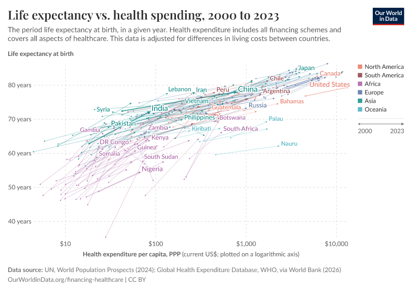 The visualization shows the relationship between life expectancy at birth and healthcare expenditure per capita. This chart shows the level of both measures in the first and last year for which data is available. The arrows connect these two observations, thereby showing the change over time for all countries in the world.