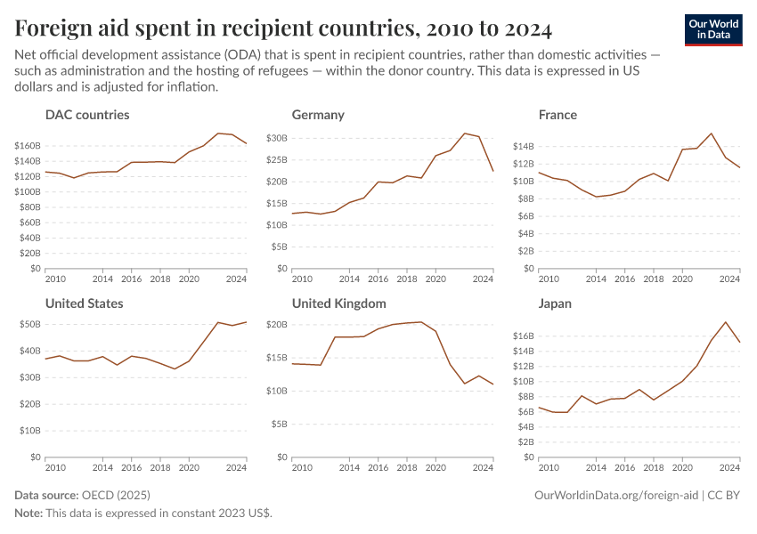 Simon van Teutem, Hannah Ritchie, and Pablo Arriagada (2025) - “How much foreign aid is spent domestically rather than overseas?” Published online at OurWorldinData.org. Retrieved from: 'https://data-measles-pipeline-fix.owid.pages.dev:8789/20260223-070107/foreign-aid-domestic-overseas.html' [Online Resource] (archived on February 23, 2026).BibTeX citation