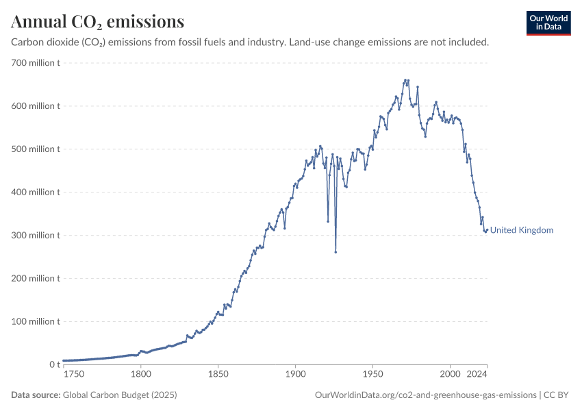 Global Carbon Budget (2025) – with major processing by Our World in Data. “Annual CO₂ emissions” [dataset]. Global Carbon Project, “Global Carbon Budget v15” [original data]. Retrieved March 2, 2026 from https://data-measles-pipeline-fix.owid.pages.dev:8789/20260223-071105/grapher/annual-co2-emissions-per-country.html (archived on February 23, 2026).