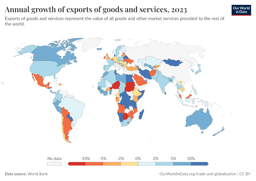 “Data Page: Annual growth of exports of goods and services”. Our World in Data (2026). Data adapted from World Bank. Retrieved from https://data-measles-pipeline-fix.owid.pages.dev:8789/20260130-180113/grapher/annual-growth-of-exports-of-goods-and-services.html [online resource] (archived on January 30, 2026).How to cite this data