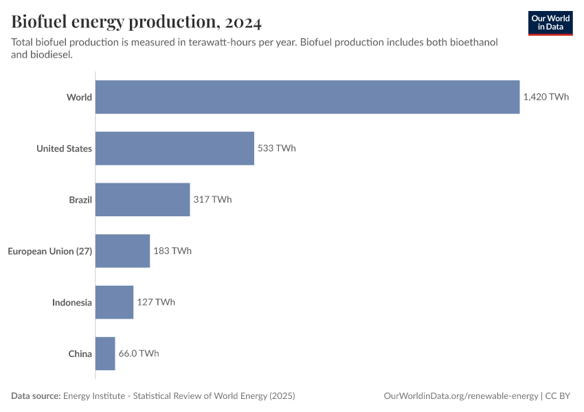 Energy Institute - Statistical Review of World Energy (2025) – with major processing by Our World in Data. “Biofuels production” [dataset]. Energy Institute, “Statistical Review of World Energy” [original data]. Retrieved March 2, 2026 from https://data-measles-pipeline-fix.owid.pages.dev:8789/20260119-065148/grapher/biofuel-production.html (archived on January 19, 2026).