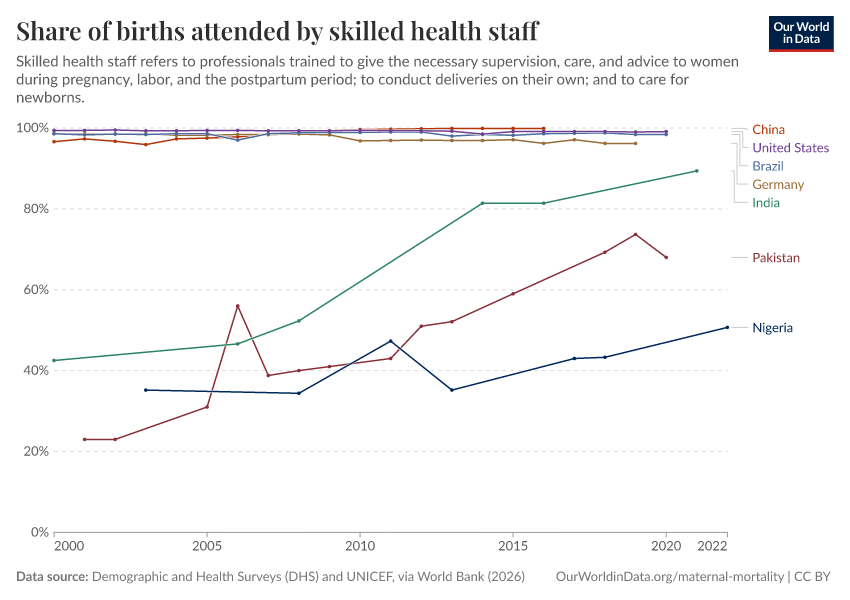 “Data Page: Share of births attended by skilled health staff”. Our World in Data (2026). Data adapted from Demographic and Health Surveys (DHS) and UNICEF, via World Bank. Retrieved from https://data-measles-pipeline-fix.owid.pages.dev:8789/20260202-181317/grapher/births-attended-by-health-staff-sdgs.html [online resource] (archived on February 2, 2026).How to cite this data