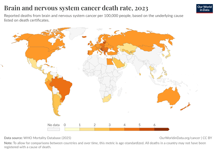 WHO Mortality Database (2025) – with minor processing by Our World in Data. “Brain and nervous system cancer death rate” [dataset]. WHO Mortality Database, “WHO Mortality Database” [original data]. Retrieved March 2, 2026 from https://data-measles-pipeline-fix.owid.pages.dev:8789/20250909-093708/grapher/brain-and-nervous-system-cancer-death-rate.html (archived on September 9, 2025).
