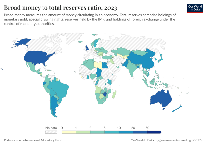 “Data Page: Broad money to total reserves ratio”. Our World in Data (2026). Data adapted from International Monetary Fund. Retrieved from https://data-measles-pipeline-fix.owid.pages.dev:8789/20251120-211749/grapher/broad-money-to-total-reserves-ratio.html [online resource] (archived on November 20, 2025).How to cite this data
