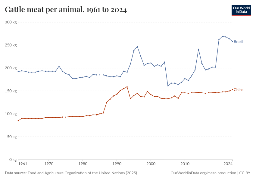Food and Agriculture Organization of the United Nations (2025) – with major processing by Our World in Data. “Cattle meat yield per animal – UN FAO” [dataset]. Food and Agriculture Organization of the United Nations, “Production: Crops and livestock products” [original data]. Retrieved March 2, 2026 from https://data-measles-pipeline-fix.owid.pages.dev:8789/20260226-122020/grapher/cattle-meat-yields-hectograms-100-grams-per-animal.html (archived on February 26, 2026).