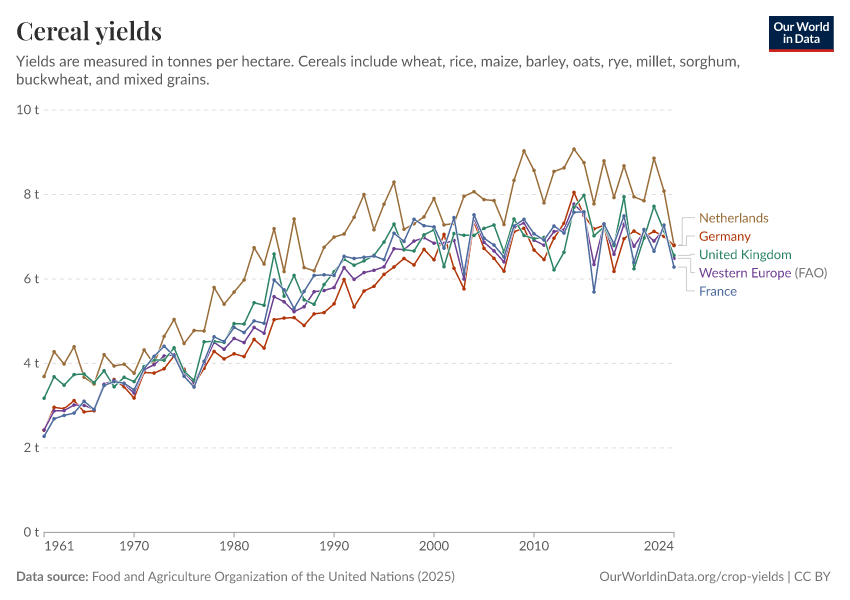 Food and Agriculture Organization of the United Nations (2025) – with major processing by Our World in Data. “Cereal yields – UN FAO” [dataset]. Food and Agriculture Organization of the United Nations, “Production: Crops and livestock products” [original data]. Retrieved March 2, 2026 from https://data-measles-pipeline-fix.owid.pages.dev:8789/20260226-122020/grapher/cereal-yield.html (archived on February 26, 2026).