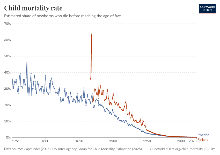 Gapminder (2015); UN Inter-agency Group for Child Mortality Estimation (2025) – processed by Our World in Data. “Child mortality rate – Gapminder; UN IGME – Long-run data” [dataset]. United Nations Inter-agency Group for Child Mortality Estimation, “United Nations Inter-agency Group for Child Mortality Estimation”; Gapminder, “Child mortality rate under age five v7”; Gapminder based on UN IGME & UN WPP, “Under-five Mortality v11”; Various sources, “Population” [original data]. Retrieved March 2, 2026 from https://data-measles-pipeline-fix.owid.pages.dev:8789/20260119-070102/grapher/child-mortality.html (archived on January 19, 2026).