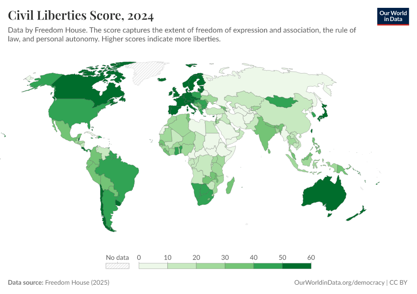 Freedom House (2025) – processed by Our World in Data. “Civil Liberties Score” [dataset]. Freedom House, “Freedom in the World” [original data]. Retrieved March 2, 2026 from https://data-measles-pipeline-fix.owid.pages.dev:8789/20260204-170225/grapher/civil-liberties-score-fh.html (archived on February 4, 2026).
