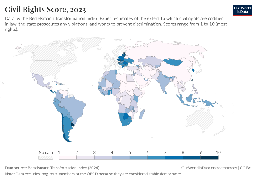 Bertelsmann Transformation Index (2024) – processed by Our World in Data. “Civil Rights Score” [dataset]. Bertelsmann Transformation Index, “Bertelsmann Transformation Index, Scores” [original data]. Retrieved March 2, 2026 from https://data-measles-pipeline-fix.owid.pages.dev:8789/20260204-165456/grapher/civil-rights-score-bti.html (archived on February 4, 2026).