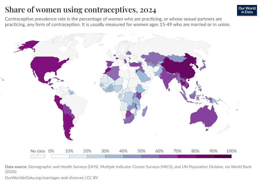 Demographic and Health Surveys (DHS), Multiple Indicator Cluster Surveys (MICS), and UN Population Division, via World Bank (2026) – processed by Our World in Data. “Share of women using contraceptives” [dataset]. Demographic and Health Surveys (DHS), Multiple Indicator Cluster Surveys (MICS), and UN Population Division, via World Bank, “World Development Indicators 125” [original data]. Retrieved March 2, 2026 from https://data-measles-pipeline-fix.owid.pages.dev:8789/20260202-181317/grapher/contraceptive-prevalence-any-methods-of-women-ages-15-49.html (archived on February 2, 2026).