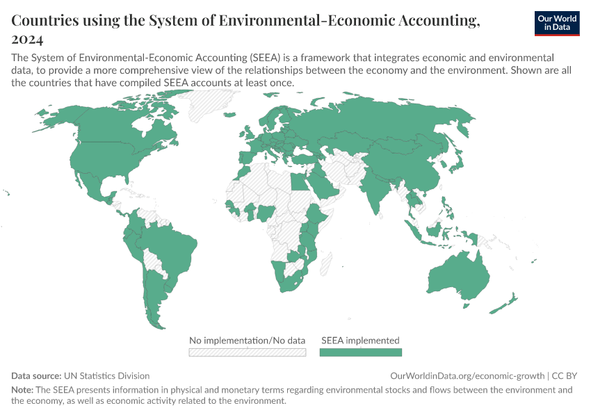 UN Statistics Division – processed by Our World in Data. “Countries using the System of Environmental-Economic Accounting” [dataset]. UN Statistics Division, “UNSTATS / WESR” [original data]. Retrieved March 2, 2026 from https://data-measles-pipeline-fix.owid.pages.dev:8789/20260130-180113/grapher/countries-using-the-system-of-environmental-economic-accounting.html (archived on January 30, 2026).