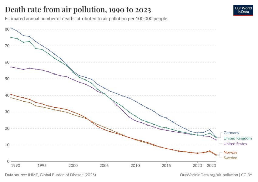 IHME, Global Burden of Disease (2025) – with major processing by Our World in Data. “Death rate from air pollution” [dataset]. IHME, Global Burden of Disease, “Global Burden of Disease - Risk Factors - Deaths” [original data]. Retrieved March 2, 2026 from https://data-measles-pipeline-fix.owid.pages.dev:8789/20260213-112438/grapher/death-rate-from-air-pollution-per-100000.html (archived on February 13, 2026).
