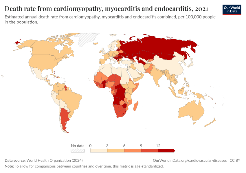 World Health Organization (2024) – with major processing by Our World in Data. “Death rate from cardiomyopathy, myocarditis and endocarditis” [dataset]. World Health Organization, “Global Health Estimates” [original data]. Retrieved March 2, 2026 from https://data-measles-pipeline-fix.owid.pages.dev:8789/20250909-093708/grapher/death-rate-from-cardiomyopathy-myocarditis-endocarditis-who-ghe-age-standardized.html (archived on September 9, 2025).