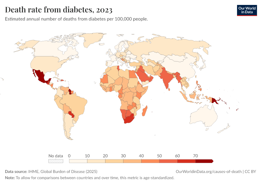 IHME, Global Burden of Disease (2025) – with major processing by Our World in Data. “Death rate from diabetes” [dataset]. IHME, Global Burden of Disease, “Global Burden of Disease - Deaths” [original data]. Retrieved March 2, 2026 from https://data-measles-pipeline-fix.owid.pages.dev:8789/20260211-174736/grapher/death-rate-from-diabetes.html (archived on February 11, 2026).