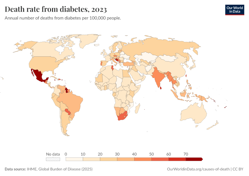 IHME, Global Burden of Disease (2025) – with major processing by Our World in Data. “Death rate from diabetes” [dataset]. IHME, Global Burden of Disease, “Global Burden of Disease - Deaths” [original data]. Retrieved March 2, 2026 from https://data-measles-pipeline-fix.owid.pages.dev:8789/20260211-174736/grapher/death-rate-from-diabetes-gbd.html (archived on February 11, 2026).