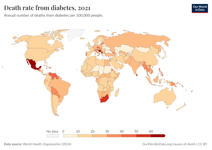 “Data Page: Death rate from diabetes”, part of the following publication: Esteban Ortiz-Ospina and Max Roser (2016) - “Global Health”. Data adapted from World Health Organization. Retrieved from https://data-measles-pipeline-fix.owid.pages.dev:8789/20250909-093708/grapher/death-rate-from-diabetes-ghe.html [online resource] (archived on September 9, 2025).How to cite this data