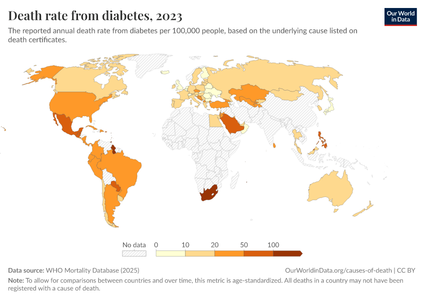 WHO Mortality Database (2025) – with minor processing by Our World in Data. “Death rate from diabetes” [dataset]. WHO Mortality Database, “WHO Mortality Database” [original data]. Retrieved March 2, 2026 from https://data-measles-pipeline-fix.owid.pages.dev:8789/20250909-093708/grapher/death-rate-from-diabetes-who-mdb.html (archived on September 9, 2025).