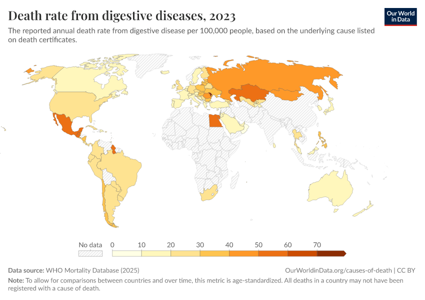 WHO Mortality Database (2025) – with minor processing by Our World in Data. “Death rate from digestive diseases” [dataset]. WHO Mortality Database, “WHO Mortality Database” [original data]. Retrieved March 2, 2026 from https://data-measles-pipeline-fix.owid.pages.dev:8789/20250909-093708/grapher/death-rate-from-digestive-diseases-who-mdb.html (archived on September 9, 2025).