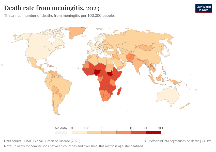 IHME, Global Burden of Disease (2025) – with major processing by Our World in Data. “Death rate from meningitis” [dataset]. IHME, Global Burden of Disease, “Global Burden of Disease - Deaths” [original data]. Retrieved March 2, 2026 from https://data-measles-pipeline-fix.owid.pages.dev:8789/20260211-174736/grapher/death-rate-from-meningitis.html (archived on February 11, 2026).