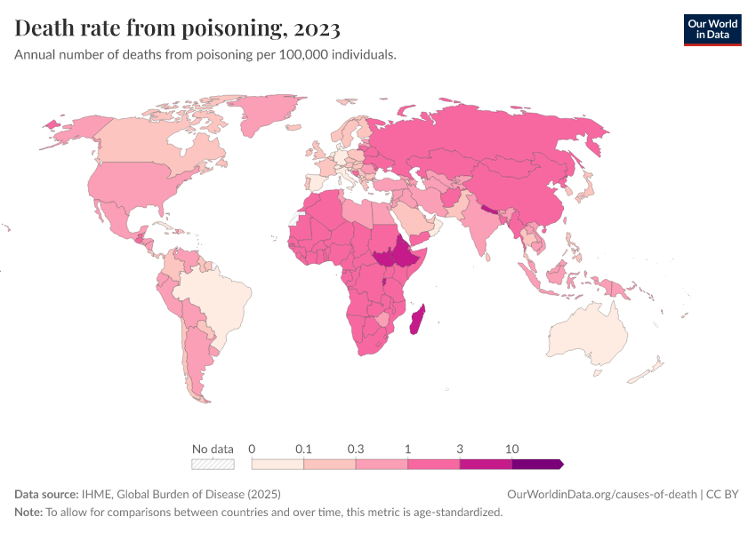IHME, Global Burden of Disease (2025) – with major processing by Our World in Data. “Death rate from poisoning” [dataset]. IHME, Global Burden of Disease, “Global Burden of Disease - Deaths” [original data]. Retrieved March 2, 2026 from https://data-measles-pipeline-fix.owid.pages.dev:8789/20260211-174736/grapher/death-rate-from-poisoning.html (archived on February 11, 2026).