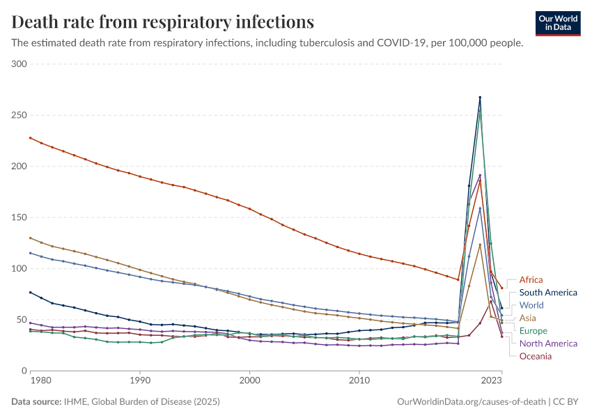 IHME, Global Burden of Disease (2025) – with major processing by Our World in Data. “Death rate from respiratory infections” [dataset]. IHME, Global Burden of Disease, “Global Burden of Disease - Deaths” [original data]. Retrieved March 2, 2026 from https://data-measles-pipeline-fix.owid.pages.dev:8789/20260211-174736/grapher/death-rate-from-respiratory-infections-gbd.html (archived on February 11, 2026).