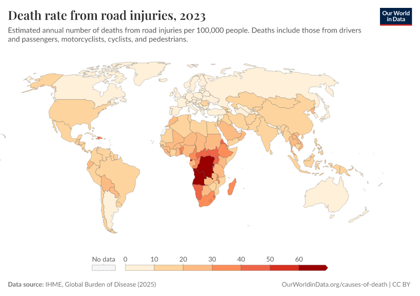 IHME, Global Burden of Disease (2025) – with major processing by Our World in Data. “Death rate from road injuries” [dataset]. IHME, Global Burden of Disease, “Global Burden of Disease - Deaths” [original data]. Retrieved March 2, 2026 from https://data-measles-pipeline-fix.owid.pages.dev:8789/20260211-174736/grapher/death-rate-from-road-accidents.html (archived on February 11, 2026).