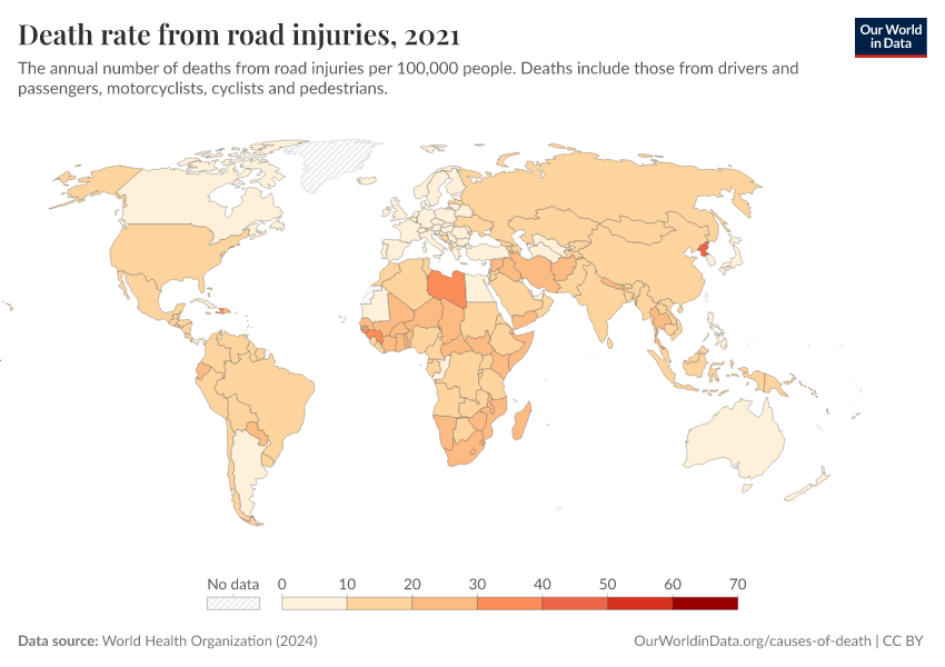 World Health Organization (2024) – with major processing by Our World in Data. “Death rate from road injuries” [dataset]. World Health Organization, “Global Health Estimates” [original data]. Retrieved March 2, 2026 from https://data-measles-pipeline-fix.owid.pages.dev:8789/20250909-093708/grapher/death-rate-from-road-accidents-ghe.html (archived on September 9, 2025).