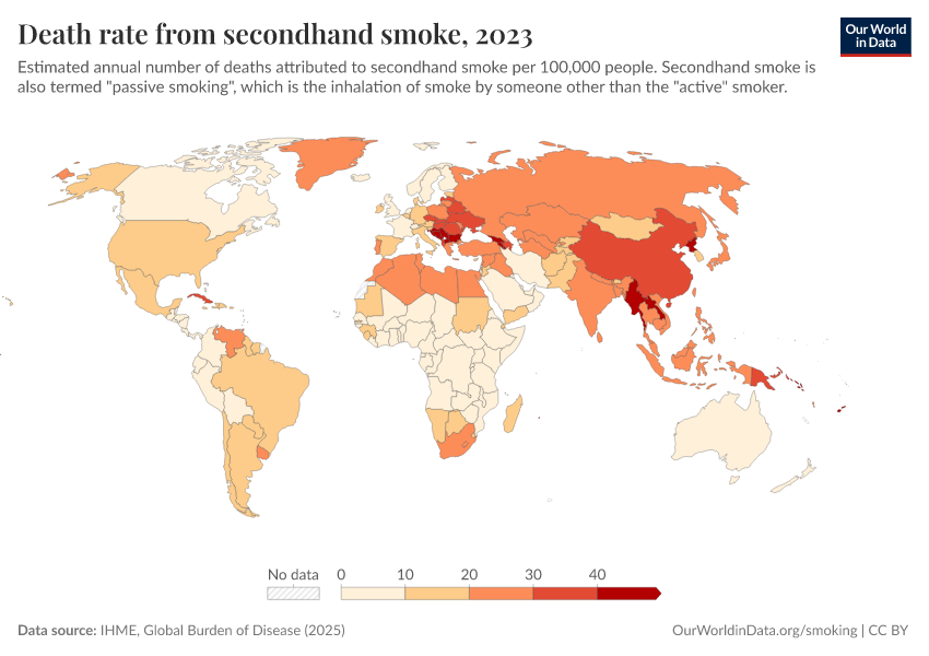 IHME, Global Burden of Disease (2025) – with major processing by Our World in Data. “Death rate from secondhand smoke” [dataset]. IHME, Global Burden of Disease, “Global Burden of Disease - Risk Factors - Deaths” [original data]. Retrieved March 2, 2026 from https://data-measles-pipeline-fix.owid.pages.dev:8789/20260213-113303/grapher/death-rate-from-secondhand-smoke-gbd.html (archived on February 13, 2026).