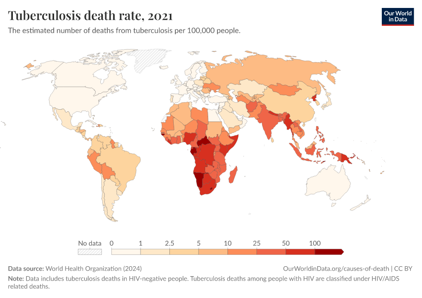 World Health Organization (2024) – with major processing by Our World in Data. “Tuberculosis death rate” [dataset]. World Health Organization, “Global Health Estimates” [original data]. Retrieved March 2, 2026 from https://data-measles-pipeline-fix.owid.pages.dev:8789/20250909-093708/grapher/death-rate-from-tuberculosis-ghe.html (archived on September 9, 2025).