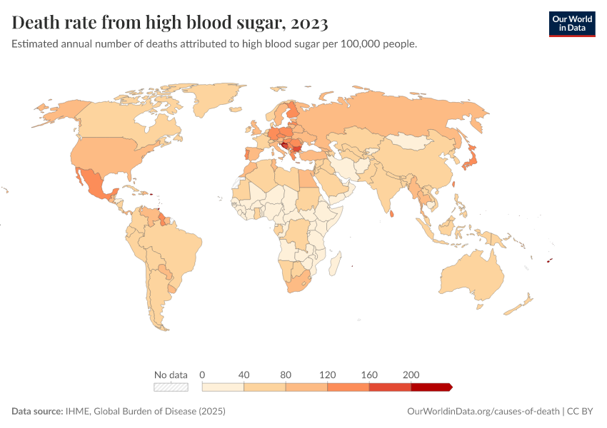 IHME, Global Burden of Disease (2025) – with major processing by Our World in Data. “Death rate from high blood sugar” [dataset]. IHME, Global Burden of Disease, “Global Burden of Disease - Risk Factors - Deaths” [original data]. Retrieved March 2, 2026 from https://data-measles-pipeline-fix.owid.pages.dev:8789/20260213-112438/grapher/death-rates-from-high-blood-sugar-gbd.html (archived on February 13, 2026).