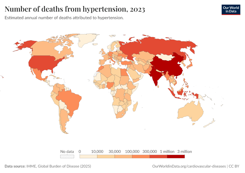 “Data Page: Number of deaths from hypertension”, part of the following publication: Esteban Ortiz-Ospina and Max Roser (2016) - “Global Health”. Data adapted from IHME, Global Burden of Disease. Retrieved from https://data-measles-pipeline-fix.owid.pages.dev:8789/20260213-112438/grapher/deaths-due-to-high-blood-pressure.html [online resource] (archived on February 13, 2026).How to cite this data