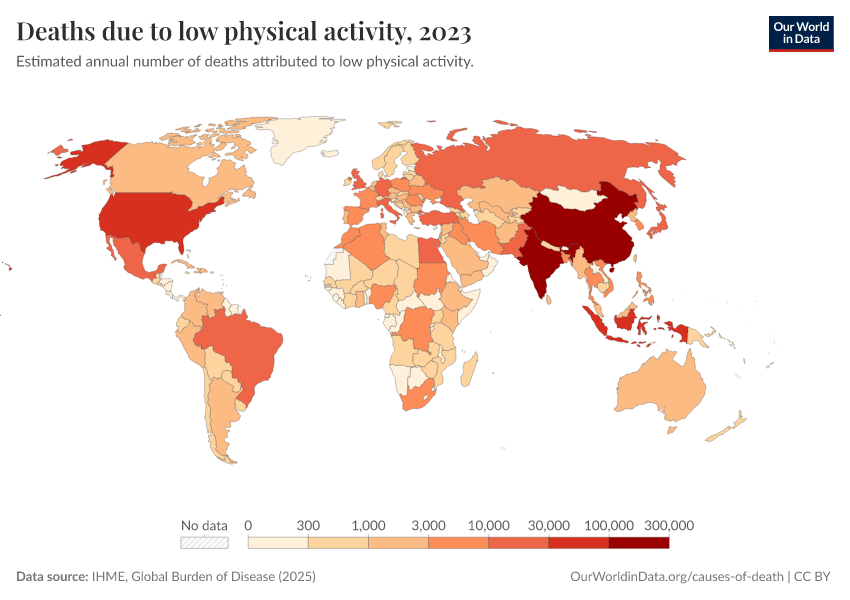 IHME, Global Burden of Disease (2025) – with major processing by Our World in Data. “Deaths due to low physical activity” [dataset]. IHME, Global Burden of Disease, “Global Burden of Disease - Risk Factors - Deaths” [original data]. Retrieved March 2, 2026 from https://data-measles-pipeline-fix.owid.pages.dev:8789/20260213-112438/grapher/deaths-due-to-low-physical-activity.html (archived on February 13, 2026).