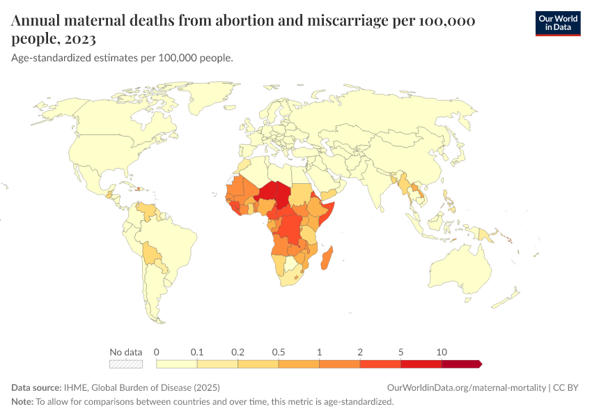 IHME, Global Burden of Disease (2025) – with major processing by Our World in Data. “Annual maternal deaths from abortion and miscarriage per 100,000 people” [dataset]. IHME, Global Burden of Disease, “Global Burden of Disease - Deaths” [original data]. Retrieved March 2, 2026 from https://data-measles-pipeline-fix.owid.pages.dev:8789/20260211-174736/grapher/deaths-from-abortion-and-miscarriage-per-100000-people.html (archived on February 11, 2026).