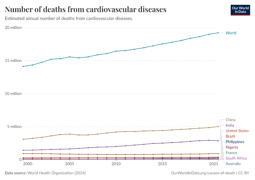 World Health Organization (2024) – with major processing by Our World in Data. “Number of deaths from cardiovascular diseases” [dataset]. World Health Organization, “Global Health Estimates” [original data]. Retrieved March 2, 2026 from https://data-measles-pipeline-fix.owid.pages.dev:8789/20250909-093708/grapher/deaths-from-cardiovascular-disease-ghe.html (archived on September 9, 2025).