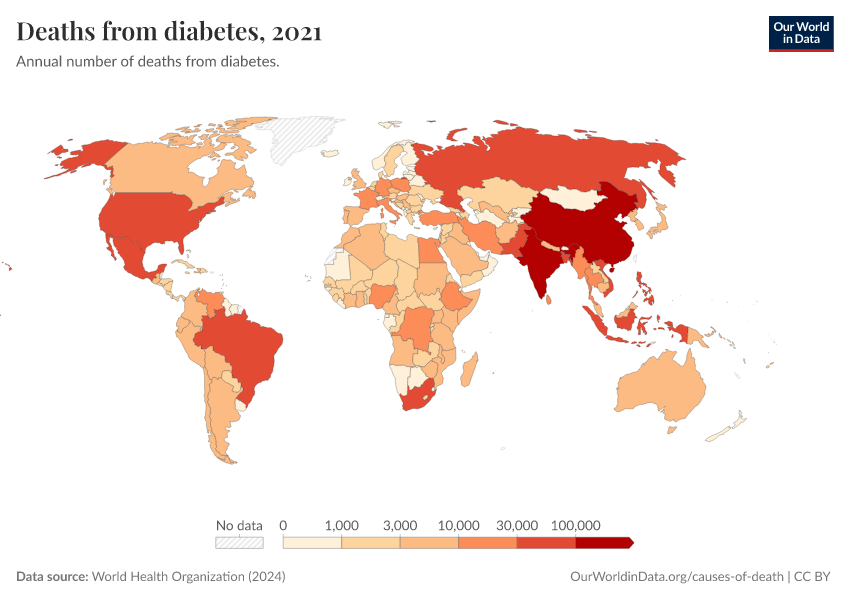 World Health Organization (2024) – with major processing by Our World in Data. “Deaths from diabetes” [dataset]. World Health Organization, “Global Health Estimates” [original data]. Retrieved March 2, 2026 from https://data-measles-pipeline-fix.owid.pages.dev:8789/20250909-093708/grapher/deaths-from-diabetes-ghe.html (archived on September 9, 2025).