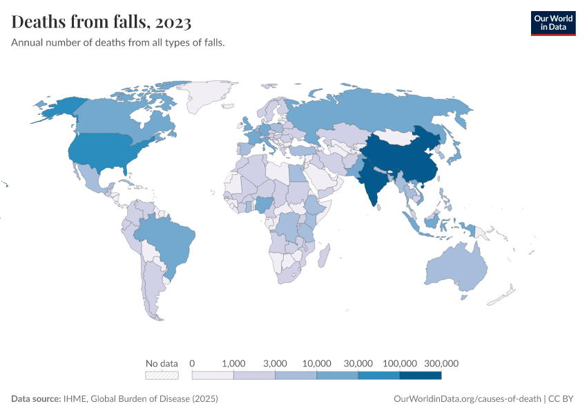 IHME, Global Burden of Disease (2025) – with major processing by Our World in Data. “Deaths from falls” [dataset]. IHME, Global Burden of Disease, “Global Burden of Disease - Deaths” [original data]. Retrieved March 2, 2026 from https://data-measles-pipeline-fix.owid.pages.dev:8789/20260211-174736/grapher/deaths-from-falls-gbd.html (archived on February 11, 2026).