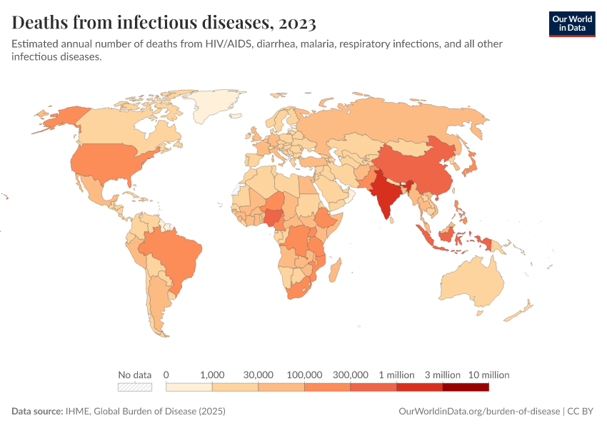 IHME, Global Burden of Disease (2025) – with major processing by Our World in Data. “Deaths from infectious diseases” [dataset]. IHME, Global Burden of Disease, “Global Burden of Disease - Deaths” [original data]. Retrieved March 2, 2026 from https://data-measles-pipeline-fix.owid.pages.dev:8789/20260211-174736/grapher/deaths-from-infectious-diseases.html (archived on February 11, 2026).