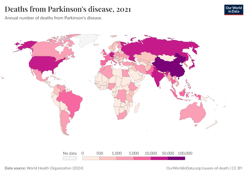 World Health Organization (2024) – with major processing by Our World in Data. “Deaths from Parkinson's disease” [dataset]. World Health Organization, “Global Health Estimates” [original data]. Retrieved March 2, 2026 from https://data-measles-pipeline-fix.owid.pages.dev:8789/20250909-093708/grapher/deaths-from-parkinsons-disease-ghe.html (archived on September 9, 2025).