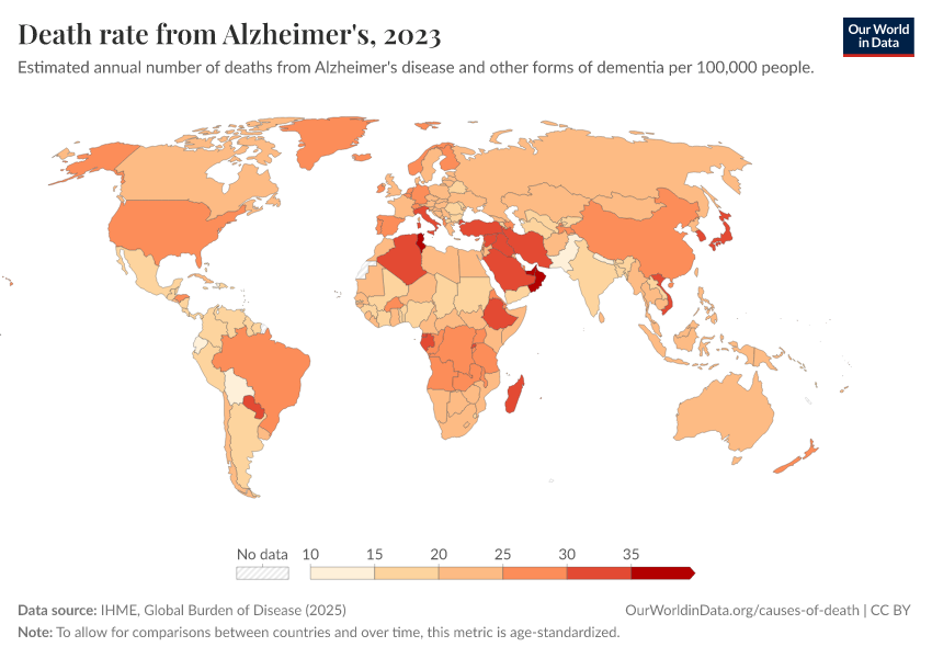 IHME, Global Burden of Disease (2025) – with major processing by Our World in Data. “Death rate from Alzheimer's” [dataset]. IHME, Global Burden of Disease, “Global Burden of Disease - Deaths” [original data]. Retrieved March 2, 2026 from https://data-measles-pipeline-fix.owid.pages.dev:8789/20260211-173942/grapher/dementia-death-rates.html (archived on February 11, 2026).