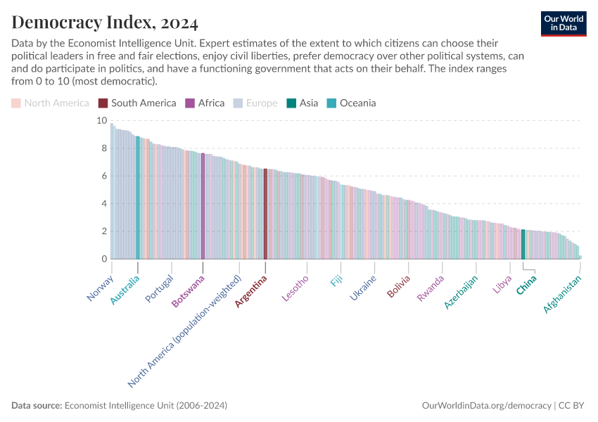 Economist Intelligence Unit (2006-2024) – processed by Our World in Data. “Democracy index – Economist Intelligence Unit” [dataset]. Economist Intelligence Unit, “Democracy Index 2021: The China challenge”; Economist Intelligence Unit, “Democracy Index 2022: Frontline democracy and the battle for Ukraine”; Economist Intelligence Unit, “Democracy Index 2023: Age of Conflict”; Economist Intelligence Unit, “Democracy Index 2024: What's wrong with representative democracy?”; Gapminder, “Democracy Index v4”; Various sources, “Population” [original data]. Retrieved March 2, 2026 from https://data-measles-pipeline-fix.owid.pages.dev:8789/20260119-070102/grapher/democracy-index-eiu.html (archived on January 19, 2026).