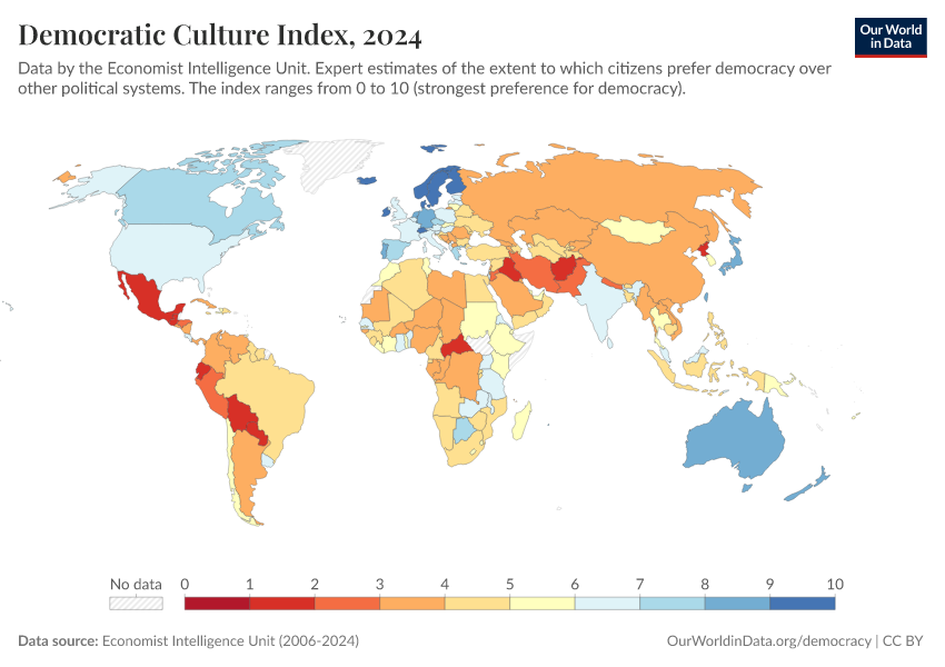 Economist Intelligence Unit (2006-2024) – processed by Our World in Data. “Democratic Culture Index” [dataset]. Economist Intelligence Unit, “Democracy Index 2021: The China challenge”; Economist Intelligence Unit, “Democracy Index 2022: Frontline democracy and the battle for Ukraine”; Economist Intelligence Unit, “Democracy Index 2023: Age of Conflict”; Economist Intelligence Unit, “Democracy Index 2024: What's wrong with representative democracy?”; Gapminder, “Democracy Index v4”; Various sources, “Population” [original data]. Retrieved March 2, 2026 from https://data-measles-pipeline-fix.owid.pages.dev:8789/20260119-070102/grapher/democratic-culture-index-eiu.html (archived on January 19, 2026).