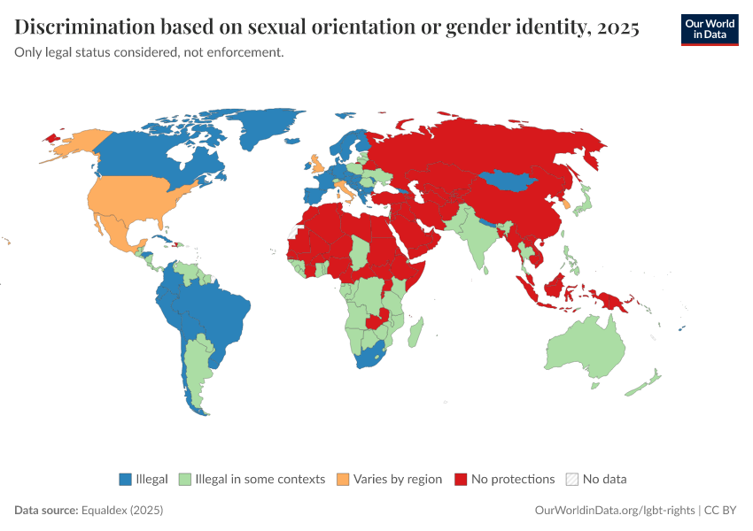 Equaldex (2025) – with major processing by Our World in Data. “Discrimination based on sexual orientation or gender identity” [dataset]. Equaldex, “Equaldex” [original data]. Retrieved March 2, 2026 from https://data-measles-pipeline-fix.owid.pages.dev:8789/20250909-093708/grapher/discrimination-lgbt-equaldex.html (archived on September 9, 2025).