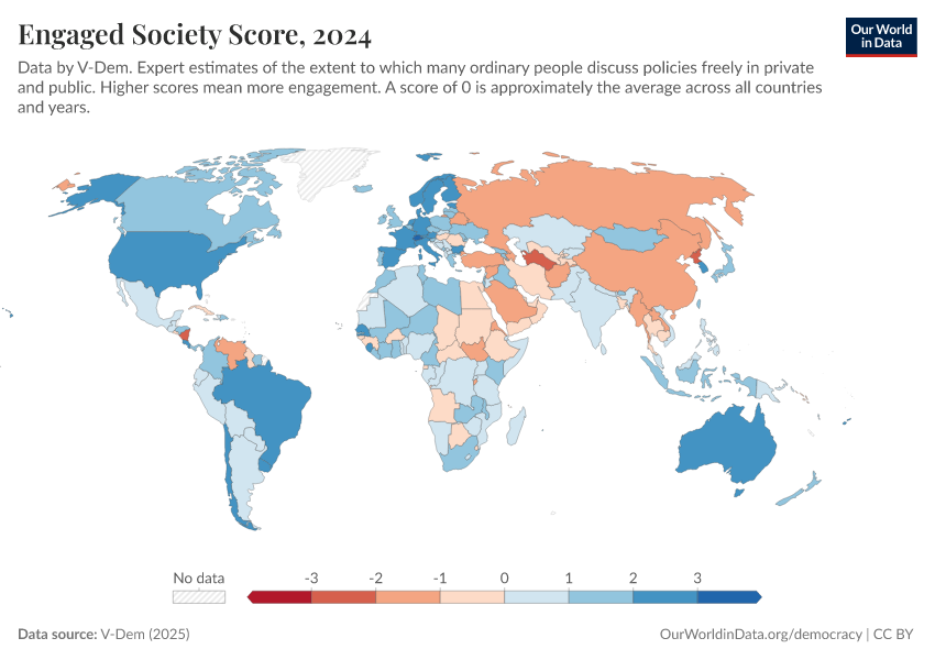 “Data Page: Engaged society”, part of the following publication: Bastian Herre, Lucas Rodés-Guirao, and Esteban Ortiz-Ospina (2013) - “Democracy”. Data adapted from V-Dem. Retrieved from https://data-measles-pipeline-fix.owid.pages.dev:8789/20260204-170225/grapher/engaged-society-score.html [online resource] (archived on February 4, 2026).How to cite this data
