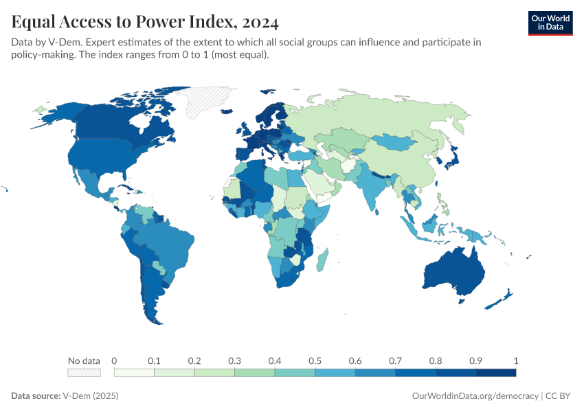 V-Dem (2025) – processed by Our World in Data. “Equal access to power index – V-Dem” [dataset]. V-Dem, “Democracy report v15” [original data]. Retrieved March 2, 2026 from https://data-measles-pipeline-fix.owid.pages.dev:8789/20260119-070102/grapher/equal-access-to-power-index.html (archived on January 19, 2026).