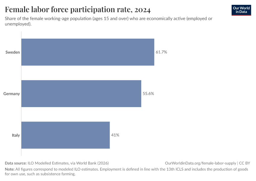 “Data Page: Female labor force participation rate”. Our World in Data (2026). Data adapted from ILO Modelled Estimates, via World Bank. Retrieved from https://data-measles-pipeline-fix.owid.pages.dev:8789/20260223-234835/grapher/female-labor-force-participation-rates.html [online resource] (archived on February 23, 2026).How to cite this data